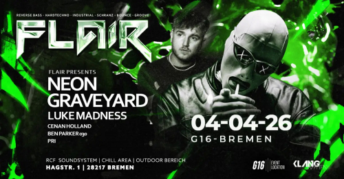Neon Graveyard bringt seinen unverwechselbaren Sound aus Reverse Bass, Hard Techno, Industrial & Schranz erstmals nach Bremen. Zum ersten Mal bei FLAIR: Luke Madness, bekannt vom legendären „Aufm Rave“ in Oldenburg.